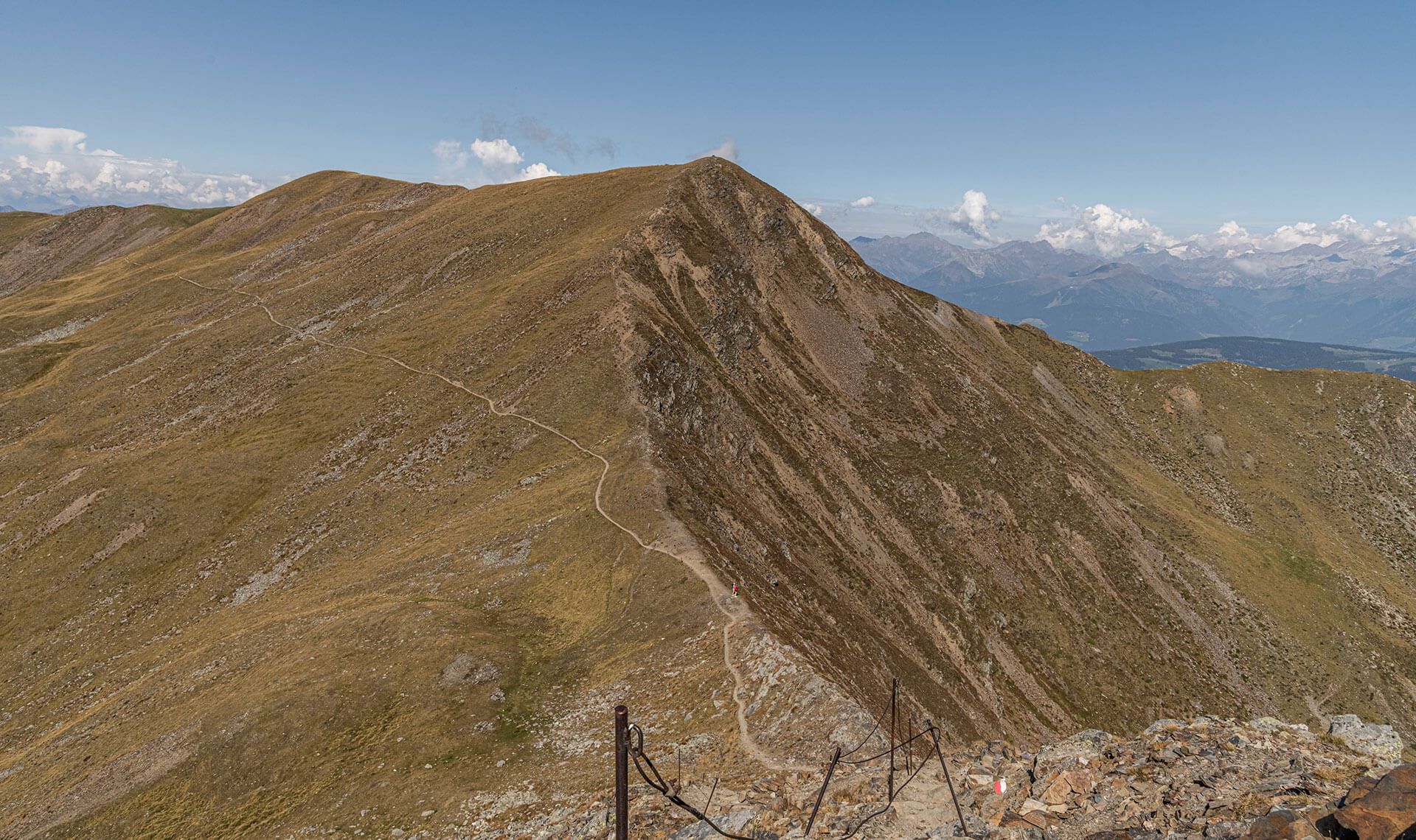 Entlang der Wanderwege und auf dem Gipfel des Gablers bieten neue Sitzbänke, nach allen Himmelsrichtungen ausgerichtet, eine Rundumsicht auf die umliegenden Berge und die Dolomiten: Dieses Panorama ist spezifisch für die Plose und eines der herausragenden Merkmale des Wandergebietes.